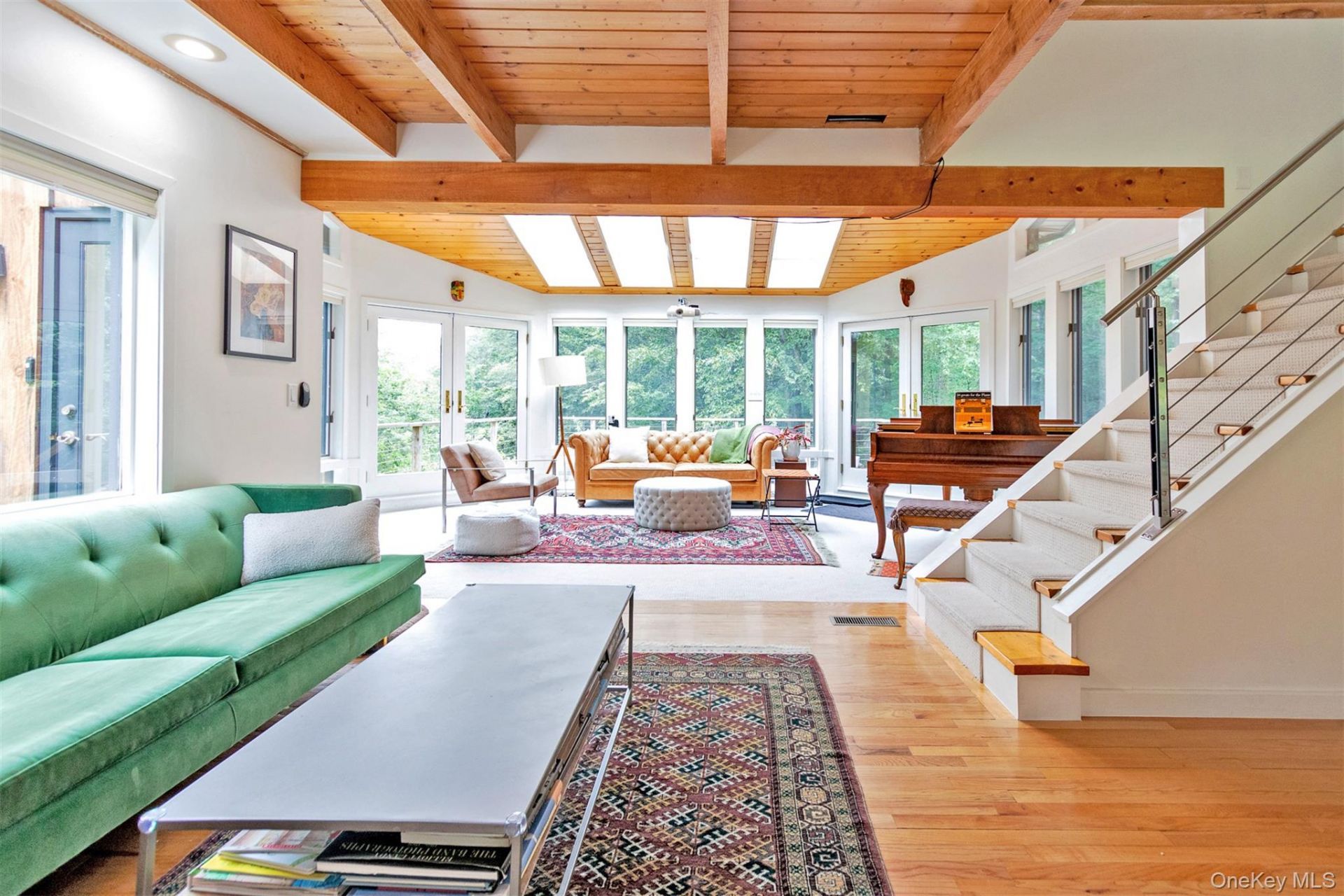 Wend up a pristine country road to this 2,300 sq ft Woodstock contemporary-arriving to total seclusion and picturesque views, yet only minutes to the Village Green. This domain is set on 4+ private acres with an additional almost 4 acre, separately-deeded, contiguous parcel that makes it an ideal property for a compound, or to use with it's maximum natural buffer for ultimate privacy. Close proximity to State land and trails from your own private road further adds to the splendor of the premises. Step into an open, flowing layout connecting the stunning, sleek and seductive kitchen with the dining and living areas. The kitchen provides easy access to an outdoor herb garden and BBQ space out back. All this is married together by vaulted and beamed ceilings, expansive windows throughout, and doors out of every first-level room-seamlessly connecting indoor spaces with outdoor living and creating a truly natural retreat. The living room basks in sunlight and boasts walls of windows and skylights, and flows out to a peaceful deck overlooking those famous Catskill Mountain views. Although the town shows this home to be two-bedrooms, the current owner is using a first floor den as an additional guest-sleeping-area. This room is joined to the main living space through a charming office/sitting area, and is surrounded by glass sliding doors with walkways to the lovely outdoors. Cozy up to a massive wood stove after enjoying outdoor activities, or just to read a novel on cold winter nights. Upstairs, you're greeted by an open loge that leads to two large bedrooms-including a primary with a NYC loft-like feel-and a luxurious shared bath. Wood floors and rich natural details add warmth and character throughout the house. Multiple decks and walkways lead to the surrounding grounds that feature a broad landscaped lawn, a fern meadow, forest, gardens with perennial plantings, and a small fruit tree orchard-perfect for outdoor enjoyment and entertaining for everyone. Dine al fresco just outside the kitchen, host gatherings, or simply relax in this tranquil setting. Electric service to the property is underground so there are no ungainly wires cluttering your views. Energy-efficient systems include: a massive rooftop solar array with backup battery, geothermal wells, and an electric car charging station that provide near off-the-grid living with minimal utility bills. All this, just minutes from Woodstock's curated shops, chef-owned restaurants, cultural attractions and recreational options, and live music eve